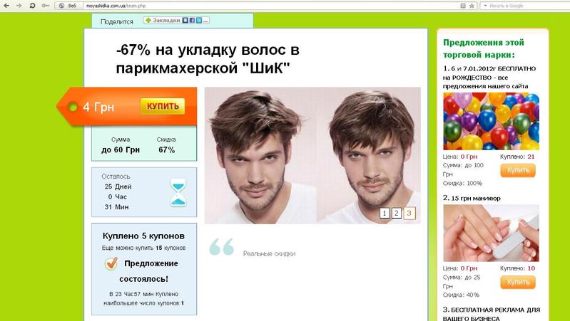 Moyaskidka.com.ua - это уникальные предложения услуг и товаров по выгодным ценам в нашем городе. Кинотеатры, кафе, экскурсии, поездки, обучающие курсы, развлечения и подарки со скидкой до 50%!!! Торопитесь покупать сертификаты "Моя скидка", так как количество сертификатов в каждой акции ограничено. Сертификаты на конкретную акцию можно купить обычно только в течение одного дня, а иногда и меньше, если все сертификаты по акции раскупаются до окончания акции. Каждый день - новое предложение!!
